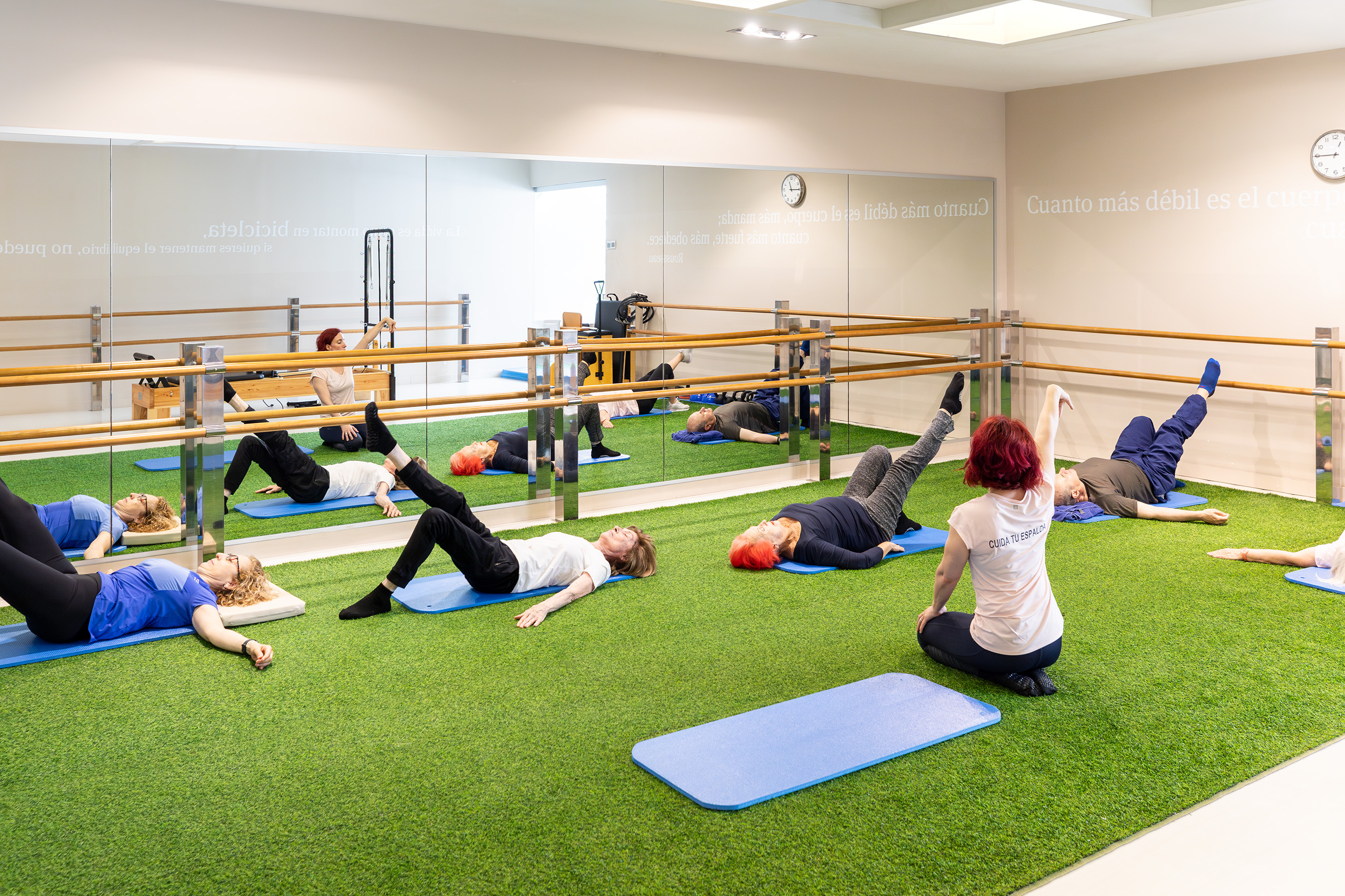 Les sessions de Spine de rehabilitació es duen a terme en grups reduïts, d’un màxim de 4 a 6 persones. Duren 50 minuts i estan dividides en els blocs d’activitat següents: